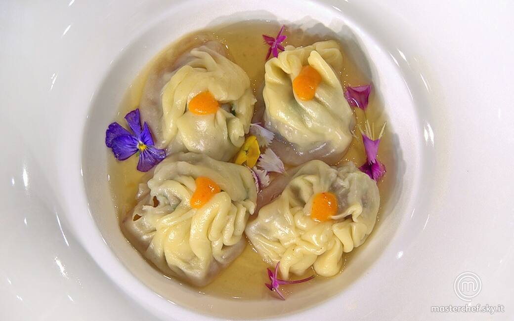 Versare il brodo tenuto da parte nelle fondine, unire i ravioli e completare con i fiori eduli, insaporendo a piacere con un filo di salsa di soia.