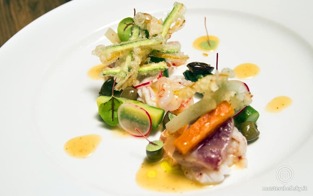 Posizionare sui piatti il pesce su 3 mucchietti e disporvi sopra e di lato le verdure sbianchite, la tempura croccante sopra e la salsa sumiso. Completare con le olive taggiasche, germogli di acetosella, il ravanello tagliato molto sottile e un filo d’olio extravergine di olive taggiasche.
