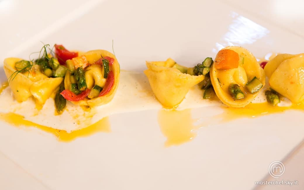 Maltagliati con verdure, gamberi di Mazzara e fondutina di parmigiano e vaniglia