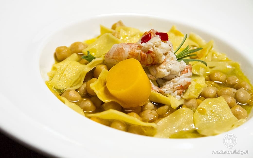 Prendere l’impasto e stenderlo sottilmente con l’aiuto di un mattarello. Tagliare la pasta dando la corretta forma. Mettere a cuocere i maltagliati nella pentola in cui stanno cuocendo i ceci. Far rosolare in padella i tre scampi puliti con un filo d’olio. Recuperare dall’abbattitore il burro che si sarà solidificato. Tirarlo fuori dalla ceramica, poggiarlo su un piattino e creare un dischetto utilizzando un piccolo coppapasta.