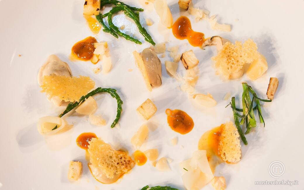 Disporre le ostriche nei piatti, aggiungere di fianco delle gocce di riccio di mare e distribuire intorno i cubetti di sedano rapa. Arrotolare le striscioline di sedano rapa e adagiarle in piedi, spolverare con le noci tritate e aggiungere sui lati la salicornia insieme a fichi. Completare con i pezzi di cialda di parmigiano.