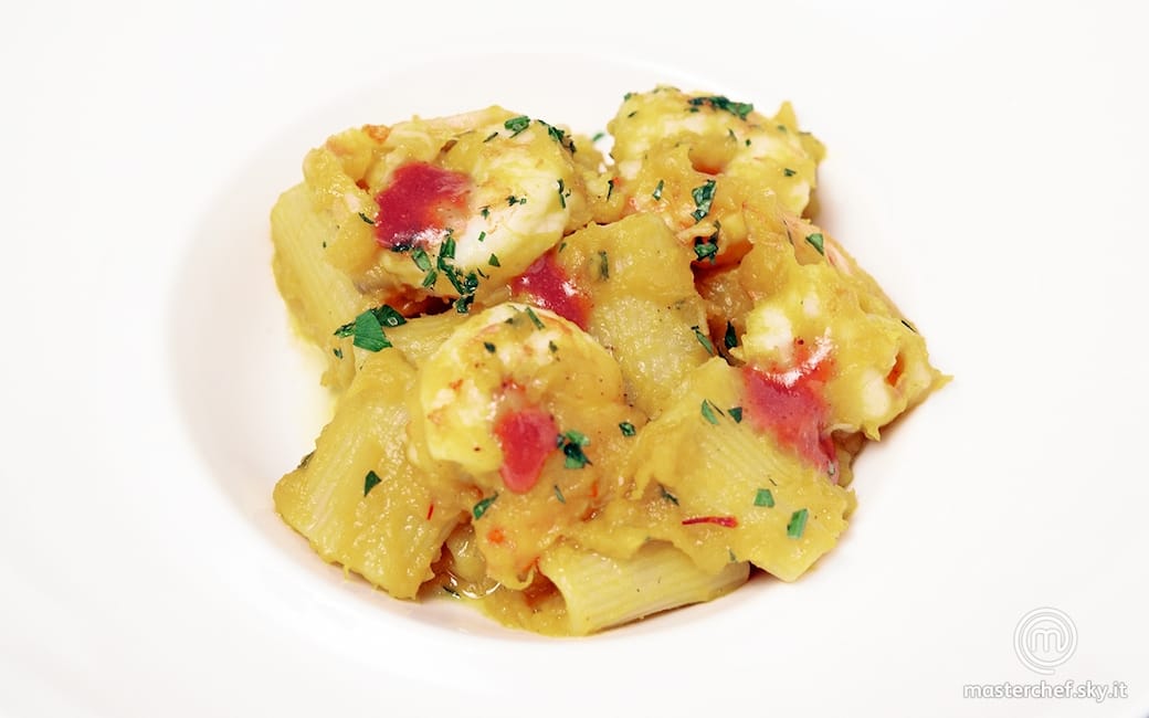 Distribuire nei piatti le mezze maniche con il composto di zucca e mazzancolle e guarnire con la salsa di mirtilli.