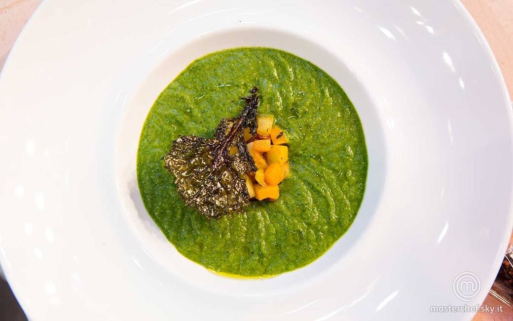 Posizionare al centro dei piatti un coppapasta tondo e distribuirvi all'interno la dadolata di verdure. Adagiare intorno il purè e sfilare il coppapasta. Guarnire con una foglia di cima di rapa croccante e completare con un filo d’olio extravergine di oliva.
