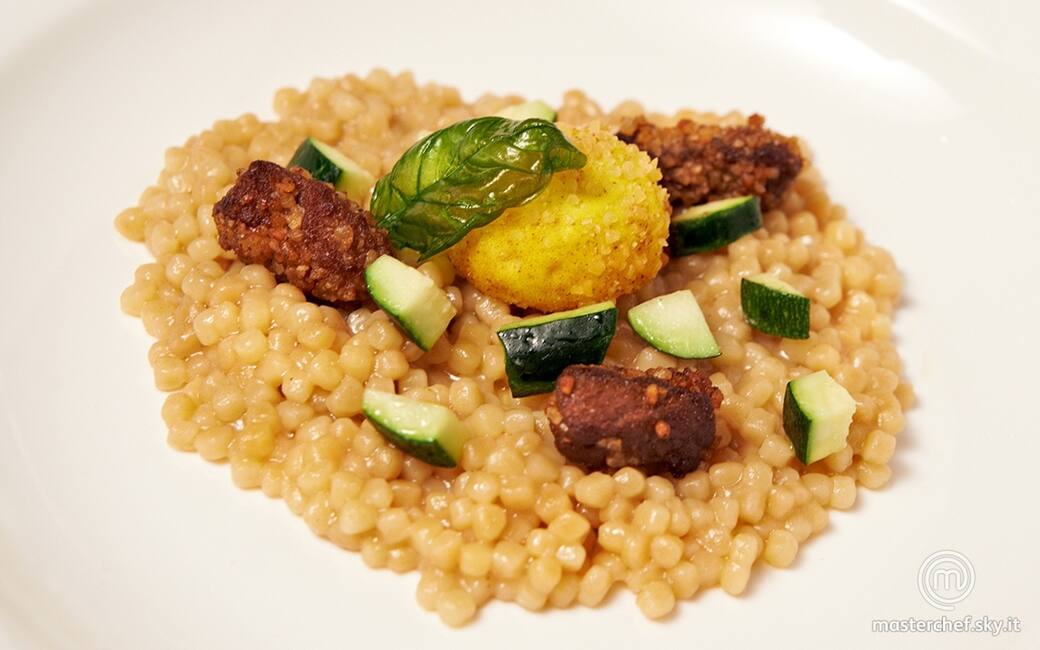 Distribuire la fregola nei piatti, adagiarvi sopra il tuorlo croccante e cospargere con la dadolata di zucchina cruda. Unire la polpa di pecora croccante e completare con la foglia di basilico fritta.