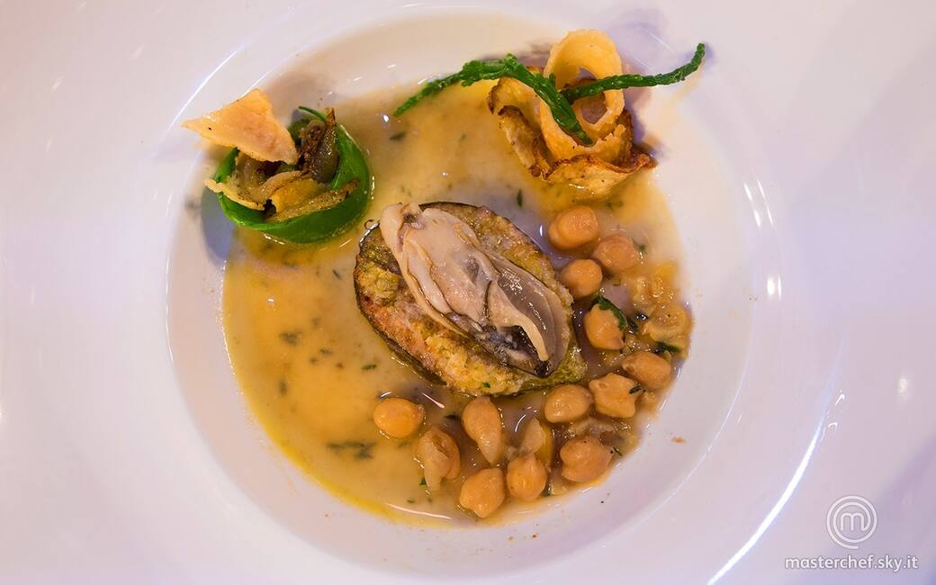 Condire la minestra di ceci con poca acqua di ricci di mare. Distribuire i ceci con parte dell'acqua di cottura nelle fondine, adagiare al centro mezzo fico e disporvi sopra un'ostrica cruda. Creare una sorta di contenitore con i baccelli dei piselli e riempirli con i piselli, la salicornia saltata e qualche pezzetto di cialda di parmigiano. Completare con una fettina di sedano rapa, su cui adagiare la cialda di parmigiano arrotolata, guarnendo con la salicornia intera.