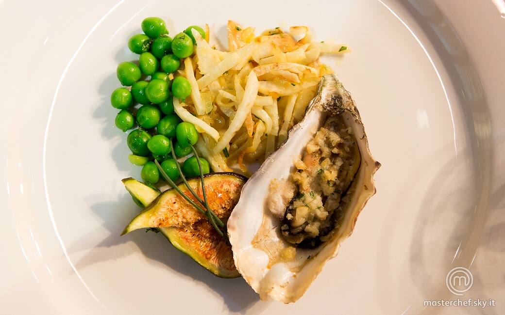 Ostrica gratinata alle noci di Macadamia e parmigiano con verdure e fichi