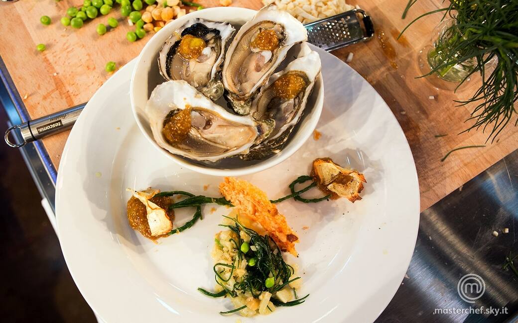 Lavare bene le ostriche, aprirle con cautela, eliminando la valva piatta, e sciacquarle. Adagiare 4 valve con il mollusco in altrettante ciotole riempite di ghiaccio, condirle con un cucchiaino di marmellata di fichi e disporle su un lato di un piatto grande. Sul lato opposto mettere un poco di risotto di sedano rapa, coprirlo con gli agretti conditi con un filo d'olio, sale e pepe, e distribuire sopra alcuni piselli. Posizionare sui due lati una cucchiaiata di marmellata di fichi e adagiarvi sopra le chips di sedano rapa al forno. Completare i piatti con la salicornia e le cialde di parmigiano.