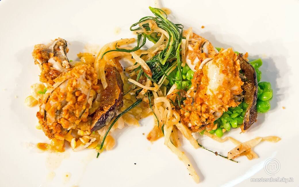 Aprire le ostriche tenendo da parte la loro acqua, lavarle bene e rimetterle insieme alla loro acqua. Tagliare i fichi a spicchi, disporli in una teglia, cospargerli di zucchero e farli caramellare in forno a 180 °C per 10-15 minuti. Lessare separatamente i piselli e i ceci con sale e pepe. Lessare anche la salicornia in acqua non salata per circa 5 minuti. Tritare le noci di macadamia e tostarle in forno.