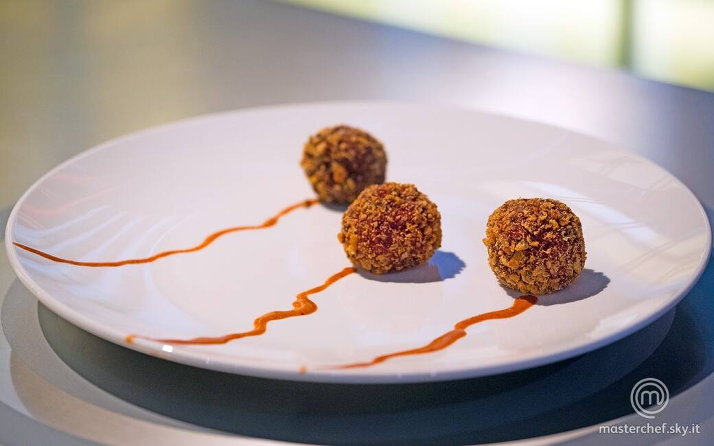 Adagiare le polpettine nei piatti e insaporire con un pizzico di sale, accompagnando con la maionese di gamberoni versata a filo di fianco a ciascuna polpetta.