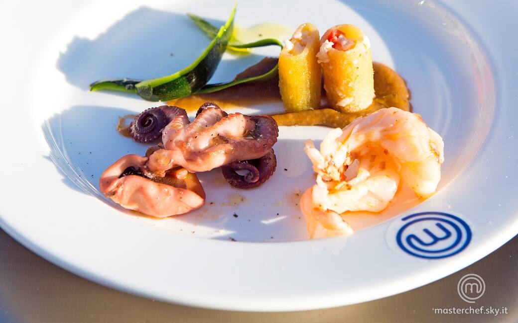 Distribuire la salsa di patate nei piatti e adagiarvi sopra, strisciandole, 2 mezze maniche ripiene, lasciandole poi in verticale. Posizionare di fianco i moscardini e i gamberoni, completando con le strisce di buccia di zucchina alla menta.