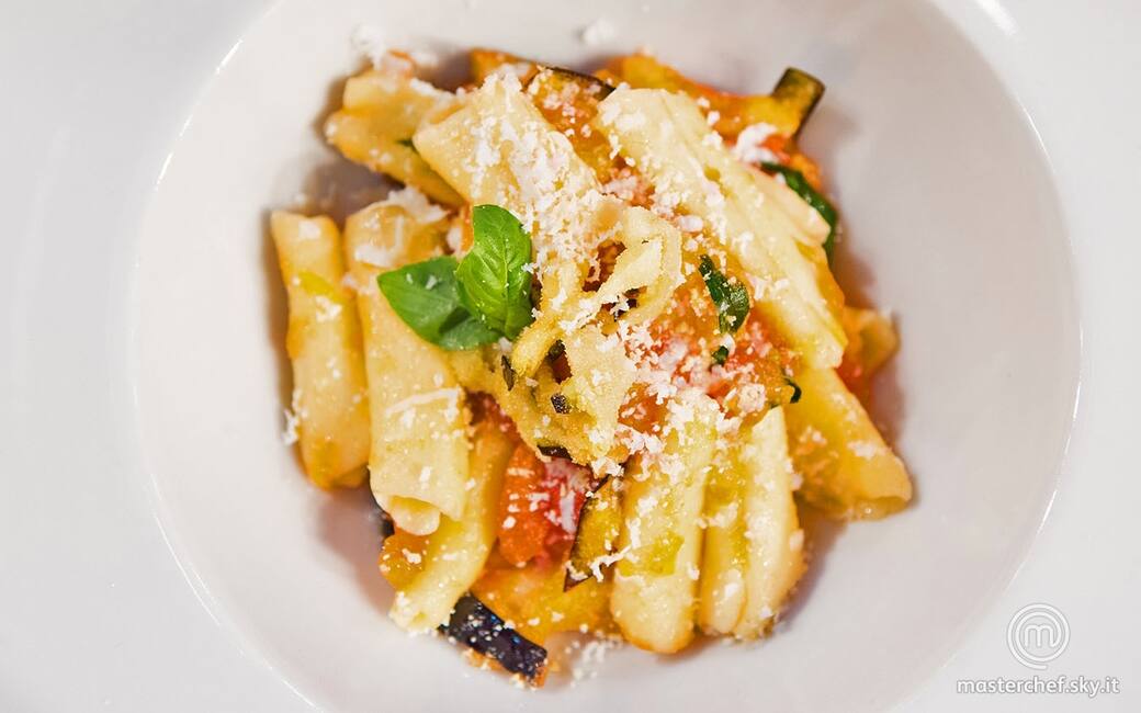 Distribuire la pasta nei piatti insieme alla melanzana fritta, insaporire con la ricotta grattugiata e guarnire con foglioline di basilico.