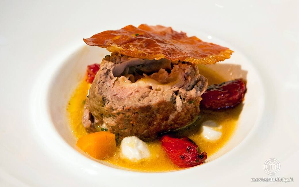 Distribuire qualche cucchiaio di fondo di cottura della carne nelle fondine e adagiare al centro una fetta spessa di rollé. Condire ai lati con qualche goccia di fonduta e unire i pomodorini e i dadini di carota. Appoggiare sopra la carne una chips di prosciutto crudo e completare con un filo d'olio.