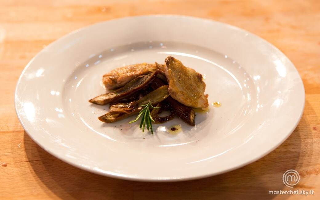 Disporre nel centro dei piatti il radicchio, i cipollotti e le melanzane. Adagiare sopra i petti di quaglia e guarnire a piacere con un ciuffetto di rosmarino.