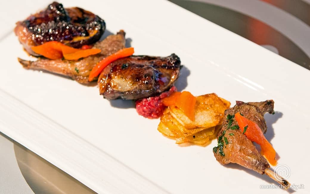 Sbucciare le patate, tagliarle a fettine e cuocerle in una padella con un filo d'olio, sale e pepe. Spellare il peperone e tagliarlo a losanghe. Insaporire le cosce di piccione con poco prezzemolo tritato. Passare al colino la salsa di carcasse e se necessario lasciarla restringere ulteriormente.