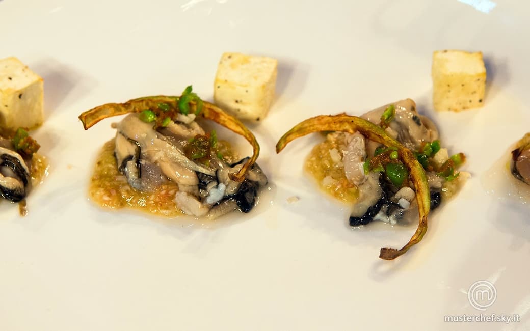 Creare sui piatti 4 basi di spuma di fichi e adagiare sopra ciascuna un'ostrica priva di acqua, poi il battuto di piselli e la buccia di sedano rapa fritta. Disporre di fianco a ogni boccone un cubetto di sedano rapa e completare con un filo d'olio e sale.