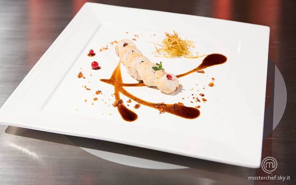 Disegnare sui piatti con la glassa al caffè tre foglie e posizionare al centro l'involtino tagliato in obliquo. Guarnire con foglioline di maggiorana, qualche mirtillo e la granella di pelle di pollo.
