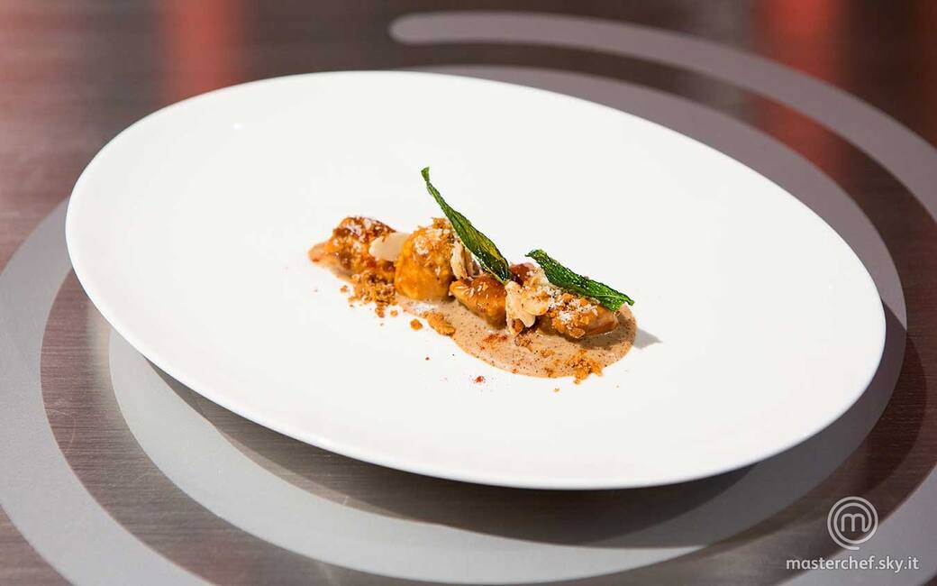 Scaldare una padella, aggiungere lo zucchero e il latte rimasti, quindi farvi caramellare le mandorle. “Vetrificare” la menta rimasta friggendo le foglie per 5 secondi in olio di semi molto caldo.