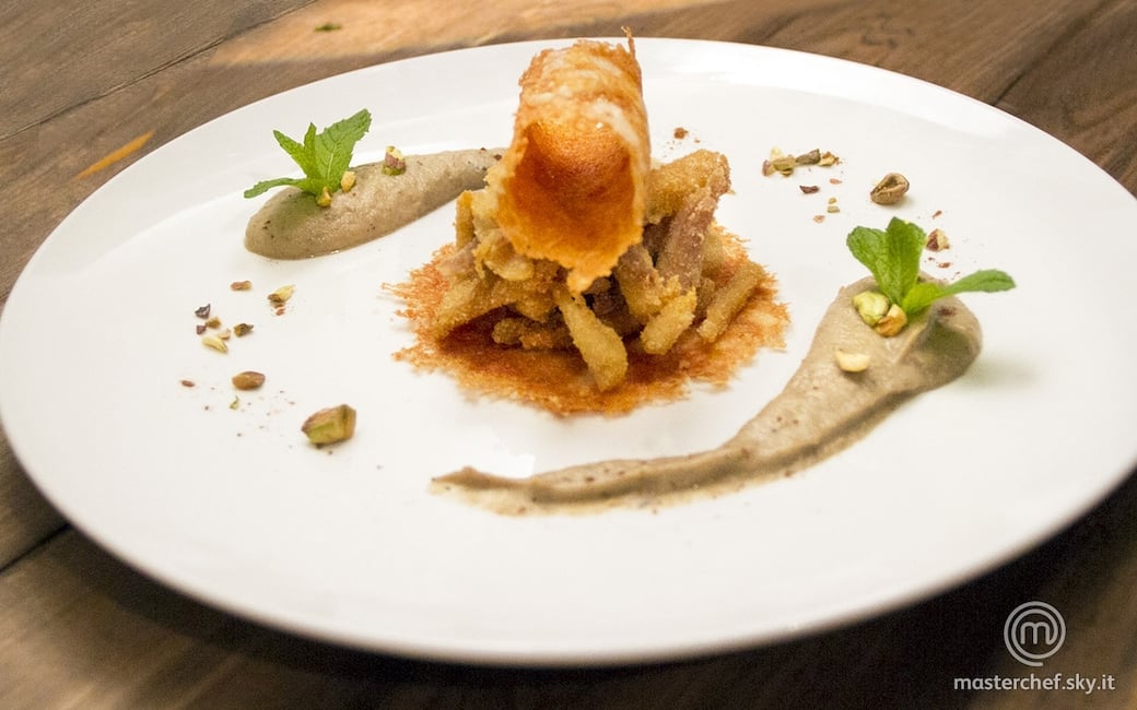 Pollo ripassato su crema di melanzana, pistacchi e cannella con cialda di Fiore sardo stagionato