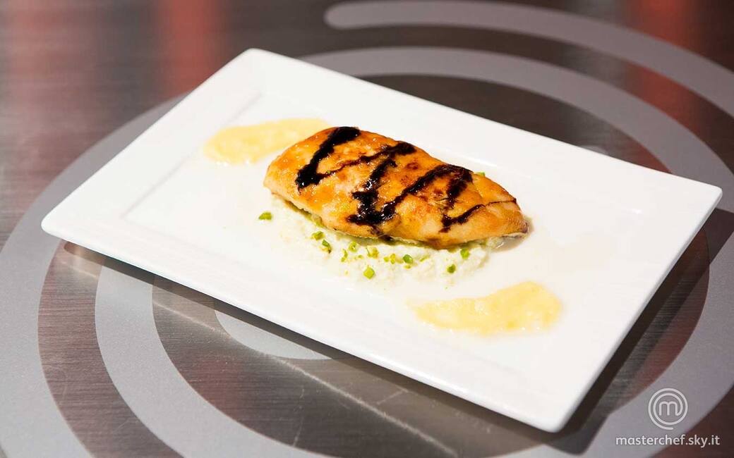 Distribuire nei piatti la crema di mozzarella ai pistacchi, adagiare sopra il petto di pollo glassato, condirlo con la riduzione di caffè e completare con il purè di mela su entrambi i lati della carne.