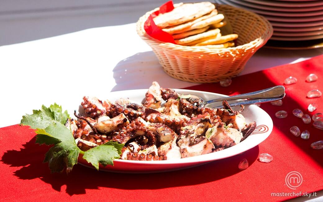Sgocciolare il polpo e cuocerlo sulla piastra molto calda per pochi minuti su ogni lato, spennellando i pezzi con la marinata. In alternativa, cuocere il polpo sulla griglia, tenendo la brace non troppo vicina.