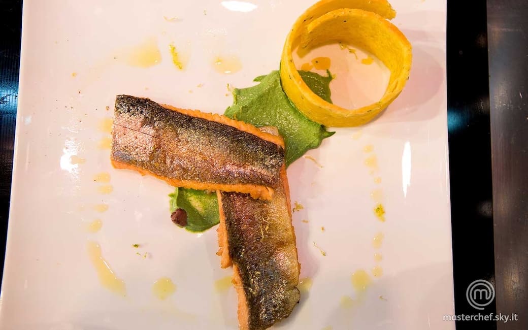 Distribuire nei piatti la crema di spinaci, adagiarvi sopra i filetti di trota e di lato i cerchi di pasta. Condire il pesce con poco succo di limone e completare con un filo d'olio tutto intorno.