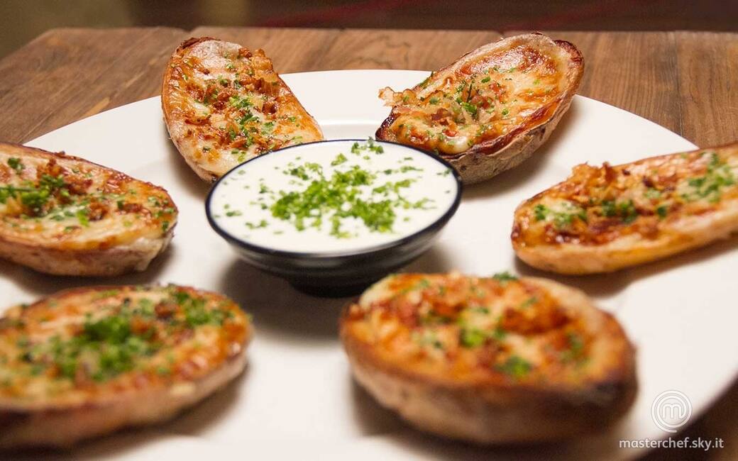 Disporre le potato skins nei piatti, cospargerle con il guanciale croccante rimasto, l’erba cipollina e una macinata di pepe, completando con un cucchiaino di panna acida su ciascuna mezza patata.