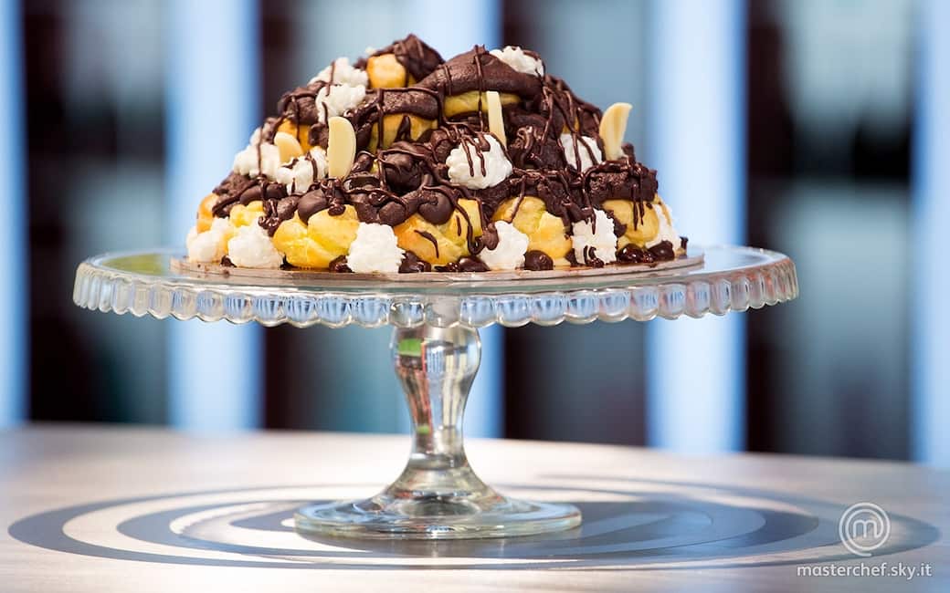 Farcire i bigné con la crema al pistacchio utilizzando la sac à poche. Disporli a piramide su un piatto da portata e versare sopra la ganache di cioccolato, completando con la panna montata a ciuffetti.
