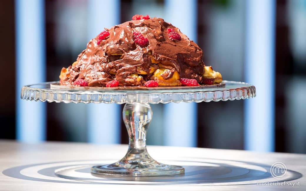 Disporre i profiteroles sul piatto da portata, intervallandoli con la Chantilly al cioccolato. Unire la Chantilly rimasta alla panna montata per ottenere una crema più densa e usare il composto per ricoprire i profiteroles. Raffreddare bene prima di servire e guarnire con i lamponi.