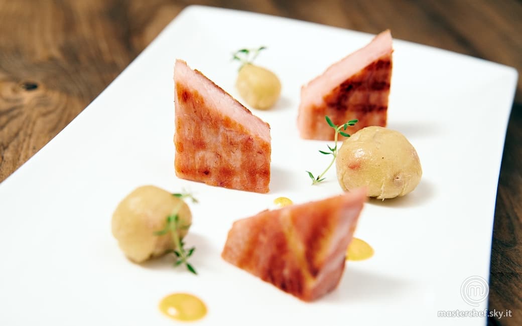 Prosciutto alla griglia con knödel di patate e salsa alla senape
