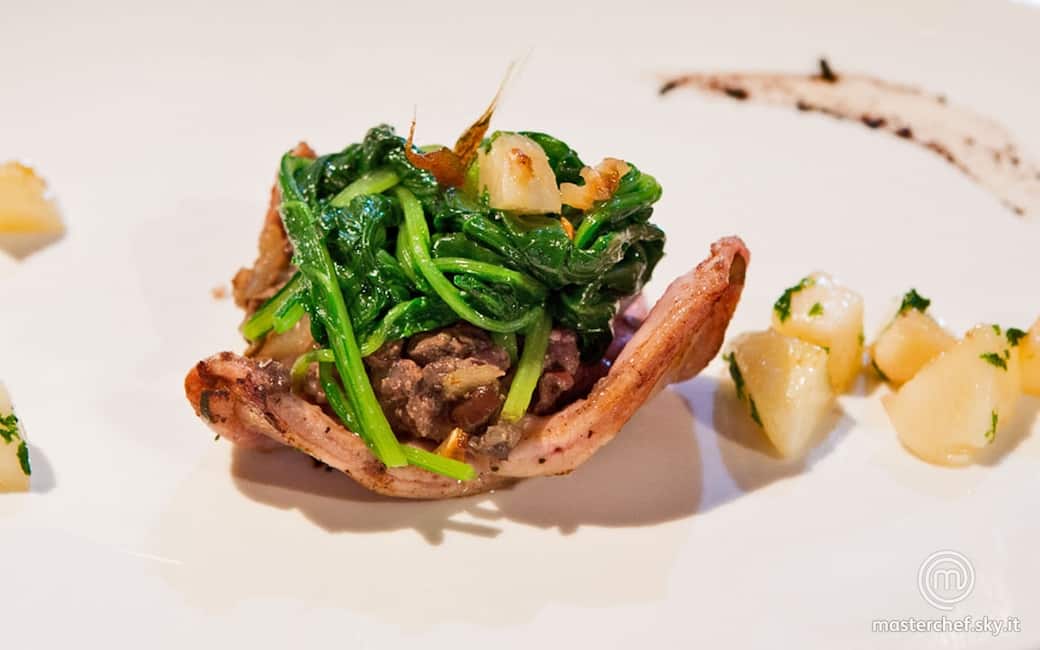 Sbucciare l'aglio nero, schiacciarlo e spennellarlo sui piatti. Adagiare i fagottini di coniglio sull'aglio, appoggiarvi sopra le bietole e completare cospargendo i dadini di pesca.