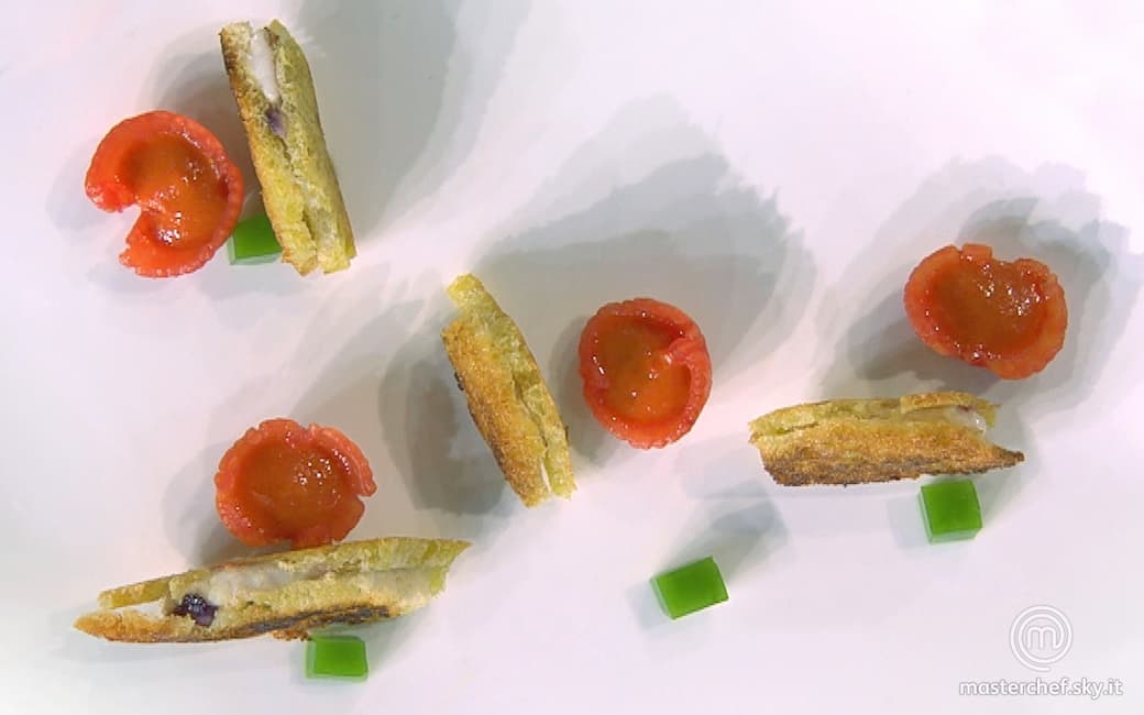 Tagliare la gelatina a cubetti regolari e distribuirli sui piatti. Riempire i gusci di ciliegini con la salsa di pomodoro e completare con i sandwich di triglia.