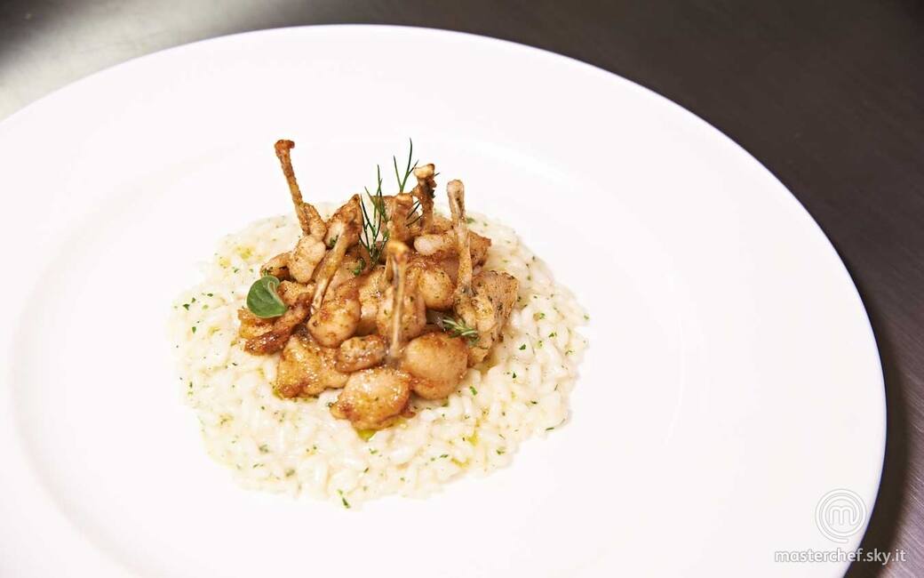 Distribuire il risotto nei piatti, adagiarvi sopra le coscette di rana ben calde e completare con una spolverata di prezzemolo tritato, guarnendo a piacere con erbe aromatiche.