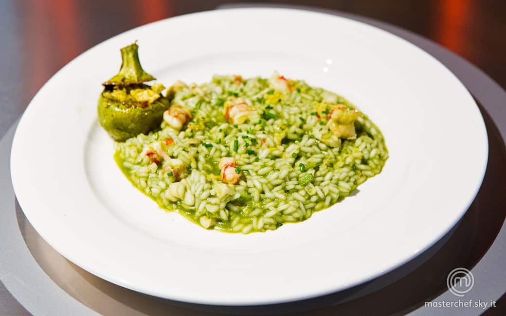 Sbucciare un cipollotto, tritarlo e farlo soffriggere in un tegame con poco olio. Unire il riso e farlo tostare per alcuni minuti, quindi sfumare con acqua bollente. Pulire e tagliare una zucchina molto finemente, delle stesse dimensioni del riso, e unirla a quest'ultimo. Portare il riso a cottura unendo poco alla volta altra acqua bollente e mescolando spesso. Circa a metà cottura, aggiungere anche mezzo cucchiaino di plancton diluito in poca acqua.