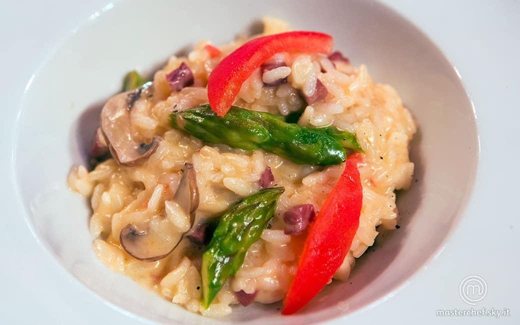 Mantecare il risotto con il burro rimasto e il parmigiano. Servirlo guarnendo i piatti con fettine di pomodoro private della pelle e dei semi.