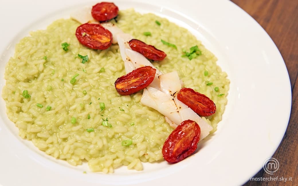 Distribuire il risotto nei piatti e adagiarvi sopra i calamari e i pomodorini confit. Completare con i gambi del prezzemolo tritati e una grattugiata di scorza di lime.