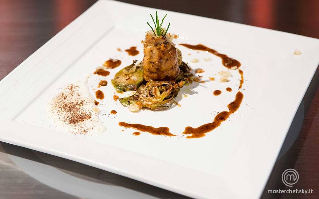 Disporre al centro dei piatti un letto di carciofi e adagiare sopra i rollé di pollo con la salsa al caffè. Creare tutto intorno una striscia con la crema di stracciatella. Disporre di fianco ai rollé le polpetta di pollo, coprire con i riccioli di tempura e guarnire con caffè in polvere.