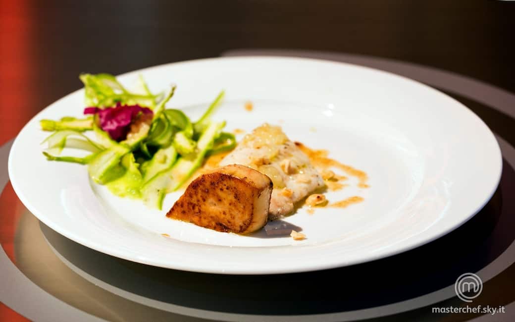 Adagiare i filetti di rombo al centro dei piatti e distribuirvi sopra il finto caviale di limone e la granella di nocciole. Appoggiare su un lato la scaloppa di foie gras con la sua salsa e completare con la crema di asparagi, di fianco, e sopra le tagliatelle di asparagi.