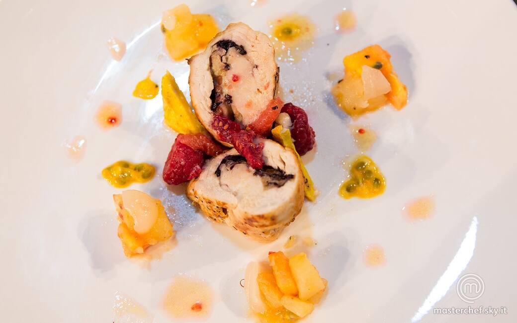 Tagliare i rotoli di pollo a fette larghe, eliminando gli stuzzicadenti, e adagiarle al centro dei piatti. Distribuire tutto intorno l'insalata di frutta con il suo condimento, tranne i lamponi, che andaranno adagiati sulla carne.
