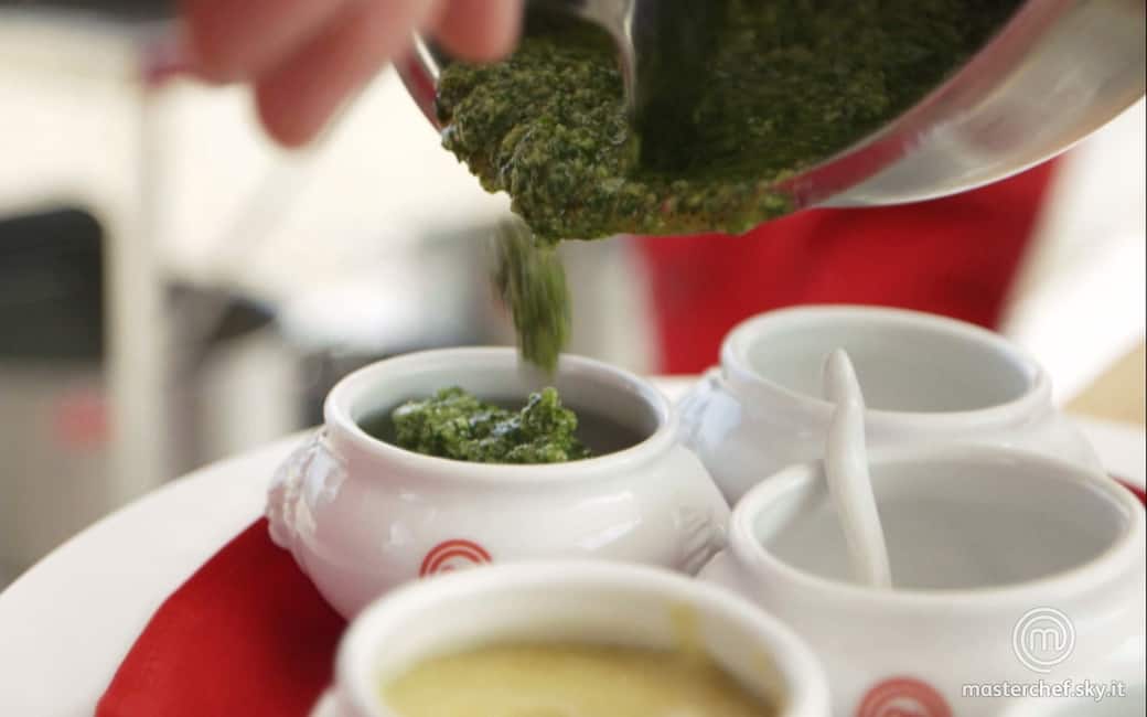 Aggiungere a filo l'olio necessario a ottenere una salsa non troppo densa. Regolare di sale. In alternativa, frullare gli ingredienti nel mixer.