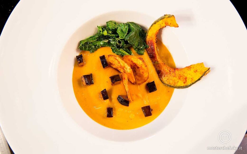 Ricavare 4 fette sottili di zucca e tenerle da parte. Soffriggere in poco olio extravergine di oliva mezzo scalogno aromatizzato con un pizzico di zenzero, di curcuma e di cannella, 2 semi di coriandolo e poca noce moscata grattugiata. Pulire e privare dei semi la restante zucca, tagliarla a cubetti e aggiungerla allo scalogno insieme a carote e patate, pulite e tagliate a cubetti. Rosolare bene, bagnare con una tazza d’acqua, coprire e portare a cottura. Frullare con il mixer emulsionando con poco olio extravergine di oliva.