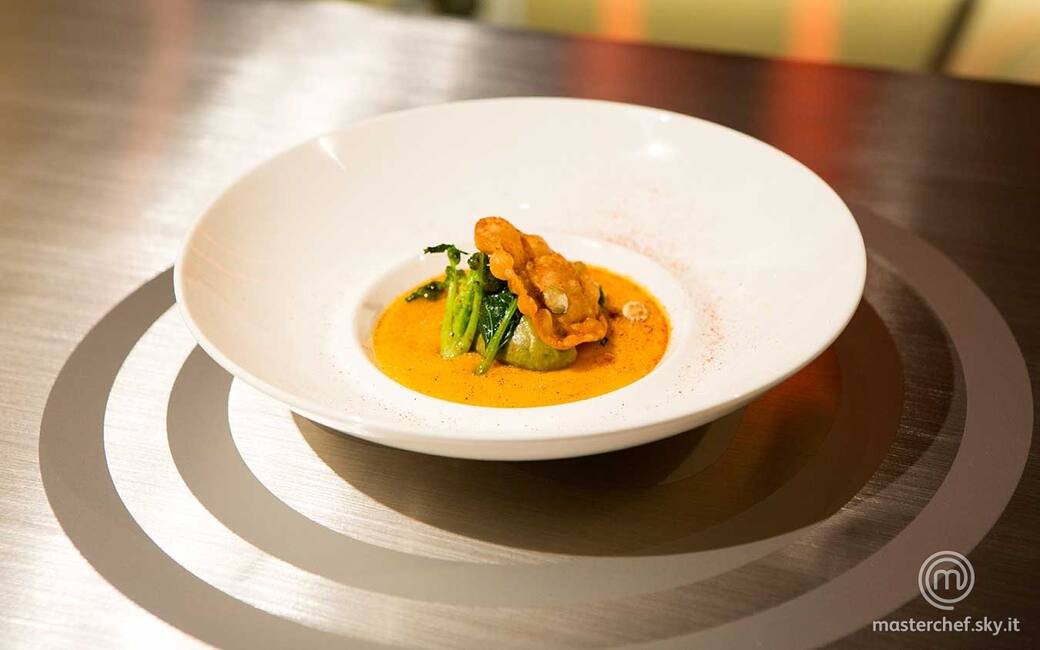 Distribuire la crema di zucca nei piatti, aggiungere al centro una quenelle di melanzane e avocado e sormontarla con le cime di rapa. Adagiare sopra qualche cialda, guarnire con i semi di zucca e completare con un filo d’olio extravergine di oliva.