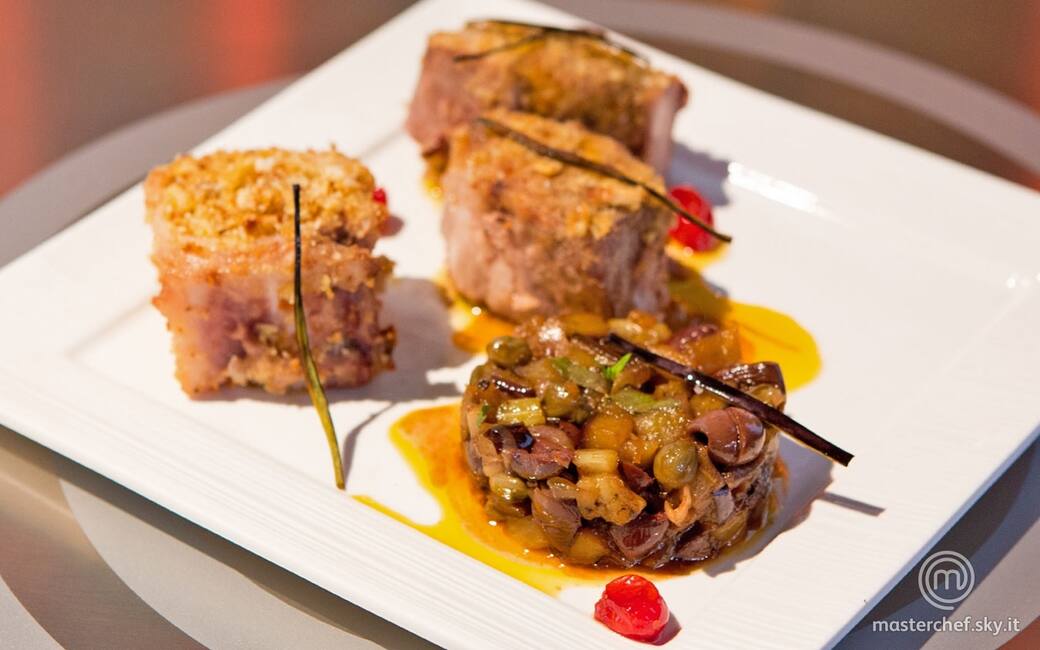 Riunire in un pentolino un bicchiere di aceto e un bicchiere scarso di zucchero. Portare sul fuoco e lasciare ridurre il composto. Versarlo sulla caponata, mescolare e lasciare che i sapori si amalgamino per qualche minuto. Togliere i midolli del tonno dall’abbattitore, impanarli con il pangrattato e i pinoli, quindi infornare a 200 °C per pochi minuti.