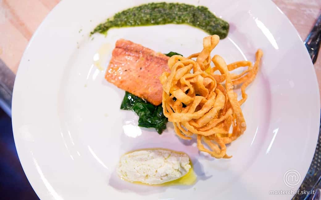Disporre al centro dei piatti gli spinaci e adagiare sopra il trancio di trota e il nido di tagliatelle fritte. Su un lato, disporre una striscia di salsa di basilico e, dall'altro lato, la quenelle di ricotta. Terminare con un giro di olio extravergine di oliva.