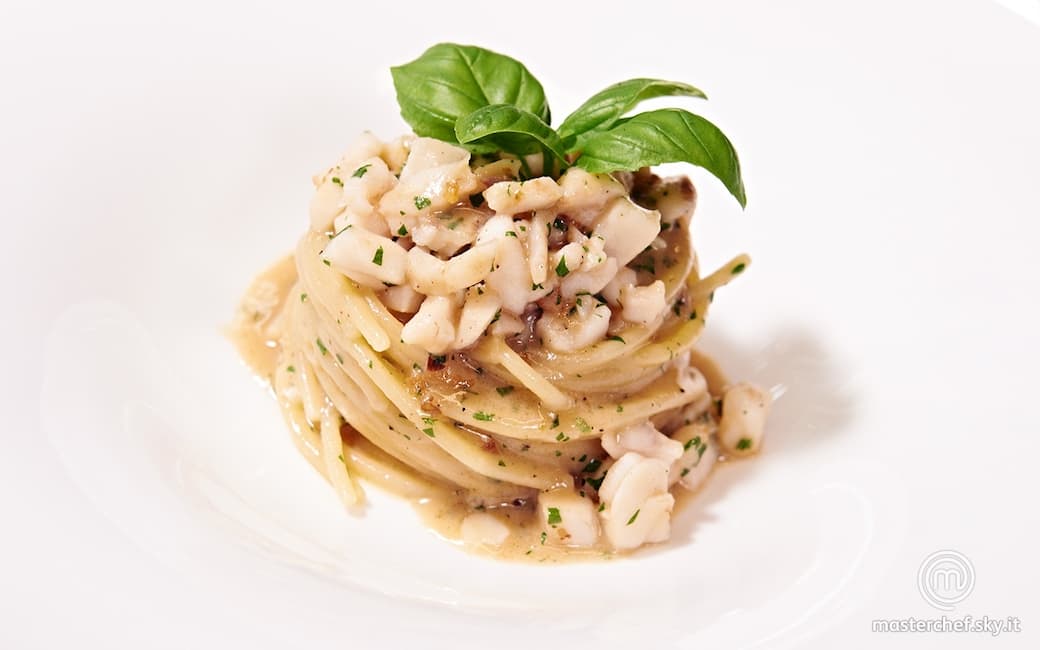 Prelevare gli spaghetti con una pinza e distribuirli in 4 anelli di acciaio appoggiati al centro delle fondine. Adagiare sopra il sugo con il pesce, utilizzando un cucchiaio, guarnire con 2 foglioline di basilico e sfilare delicatamente l'anello.