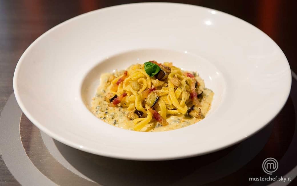 Distribuire sul fondo dei piatti la fonduta di Blu di Morozzo e adagiarvi sopra gli spaghetti. Cospargere con le melanzane, il lardo e le noci, guarnendo con una foglia di basilico.