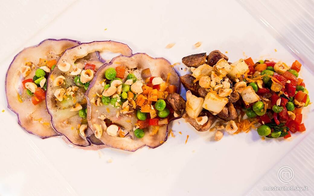 Adagiare nei piatti le fettine di melanzana fritte, alternandole con la crema di radicchio e le verdure miste. Disporre a lato i cubetti di carne e melanzana e la caponata di verdure. Cospargere con le nocciole e completare con poca scorza di arancia grattugiata, un filo d'olio extravergine di oliva e pepe.