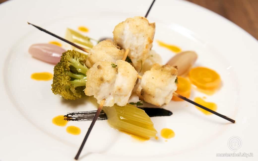 Spiedo di riccioli di sogliola croccanti con giardiniera di verdure e olio di capperi e pomodori
