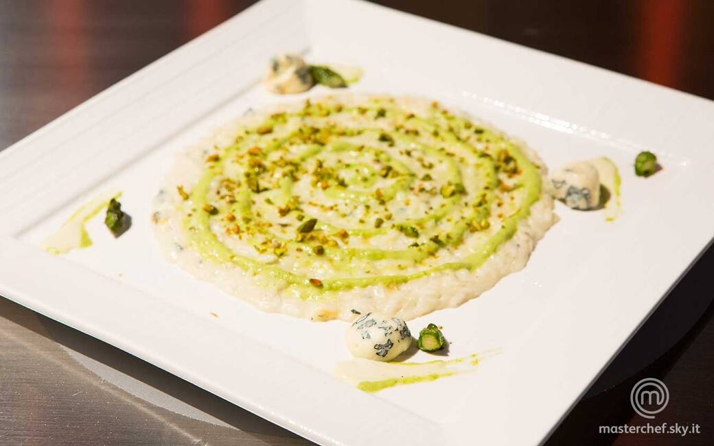Distribuire il riso nei piatti e formare una spirale con la crema di asparagi. Completare con le punte di asparago, la colatura di Blu di Morozzo rimasta e la granella di pistacchi.