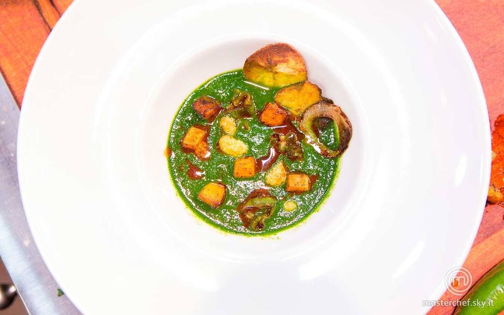 Pulire le cime di rapa e cuocerle in acqua bollente con un pizzico di zenzero e di cumino e qualche seme di coriandolo. Toglierle dal fuoco, raffreddarle in acqua e ghiaccio, scolarle e frullarle con un po’ di acqua di cottura. Aromatizzare la vellutata ottenuta con paprika e zenzero.