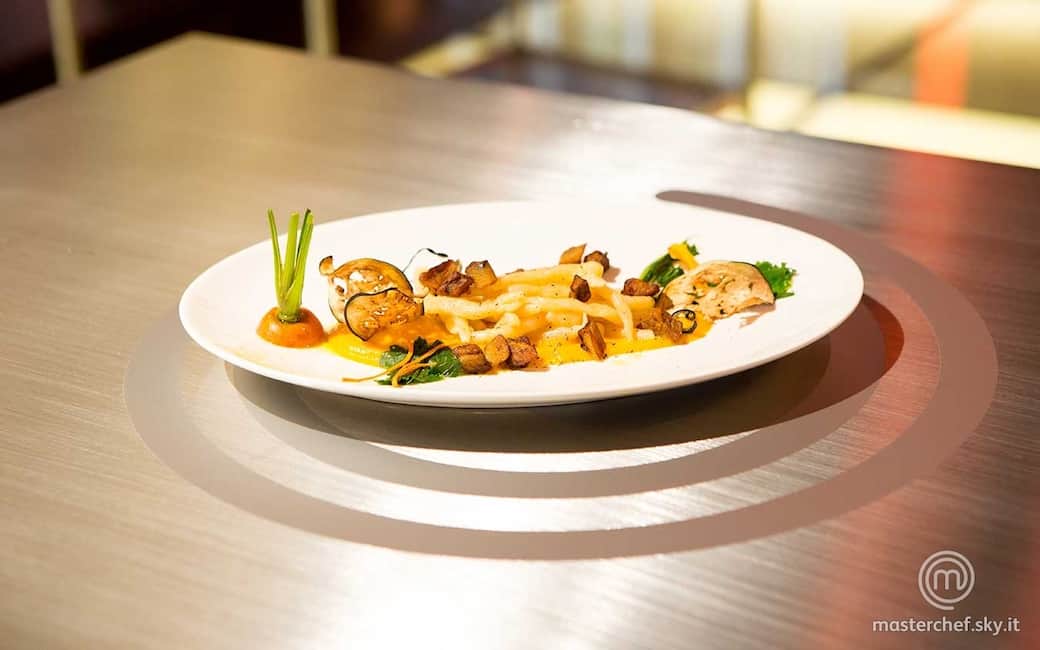 Adagiare sul fondo dei piatti la crema di zucca, patate e scalogno e posizionare sopra gli strozzapreti conditi con un filo d'olio extravergine di oliva. Completare con la melanzana fritta, la julienne di melanzane e carote e le fette di melanzana. Guarnire posizionando ai lati 2 foglie di cime di rapa e i ciuffi di carota lucidati, completando con una macinata di pepe.